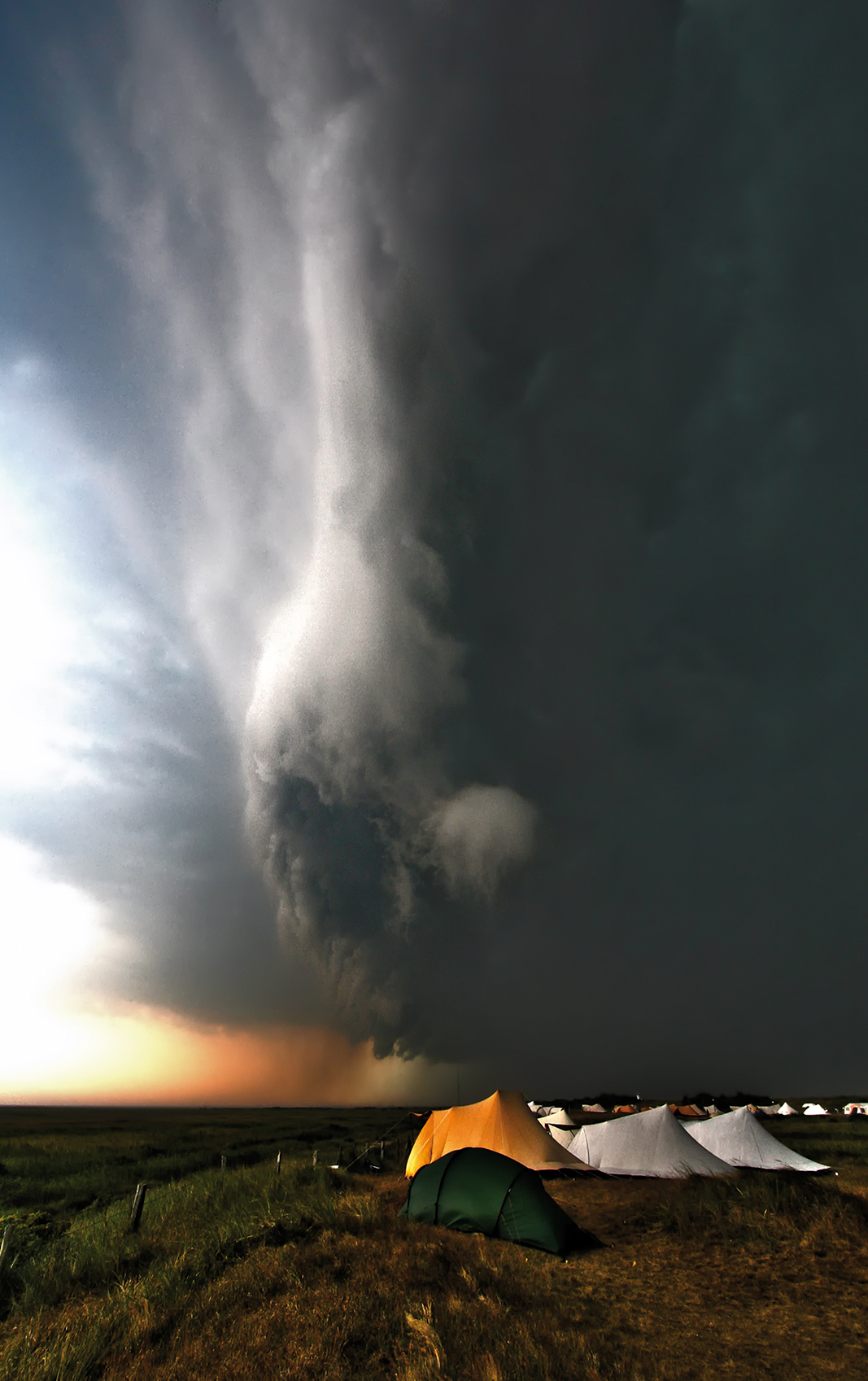 bilanz: 20 mehr oder weniger zerstörte zelte. glimpflich sind wir davongekommen: das zelt hob ab, alles purzelte durcheinander, sämtliche heringe brachen heraus - es konnte aber von innen mit vereinten kräften und am ende mit ca. 15 cm hoch hereingeströmtem wasser am boden gehalten werden ...dieselbe front hat später den campingplatz auf der helgoländer düne komplatt "platt" gemacht ...bei einem bundesweiten fotowettbewerb "ein bild und seine geschichte" der fa. cewe-color gewann oranje`s zorn den dritten preis ...
